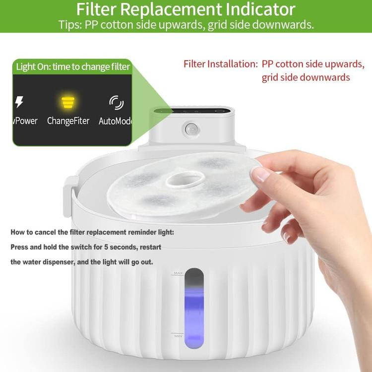 یادآوری تعویض فیلتر: فواره های آبخوری گربه موفیس به همه چیز در طراحی فکر کرده اند: نشانگر تعویض فیلتر زمانی که فیلتر به طول عمر برسد روشن می شود تا تغییر را به شما یادآوری کند. نشانگر قدرت کم (باتری) هنگامی که سطح باتری کم است چشمک می زند تا به شما یادآوری کند که تعویض باتری را به موقع انجام دهید. شما می توانید انتخاب کنید که برای عناصر فیلتر منطبق ما در گزینه های صفحه محصول، یک جعبه چهارتایی، سفارش دهید. سبک A: توزیع کننده آب، سبک B: فیلترها.