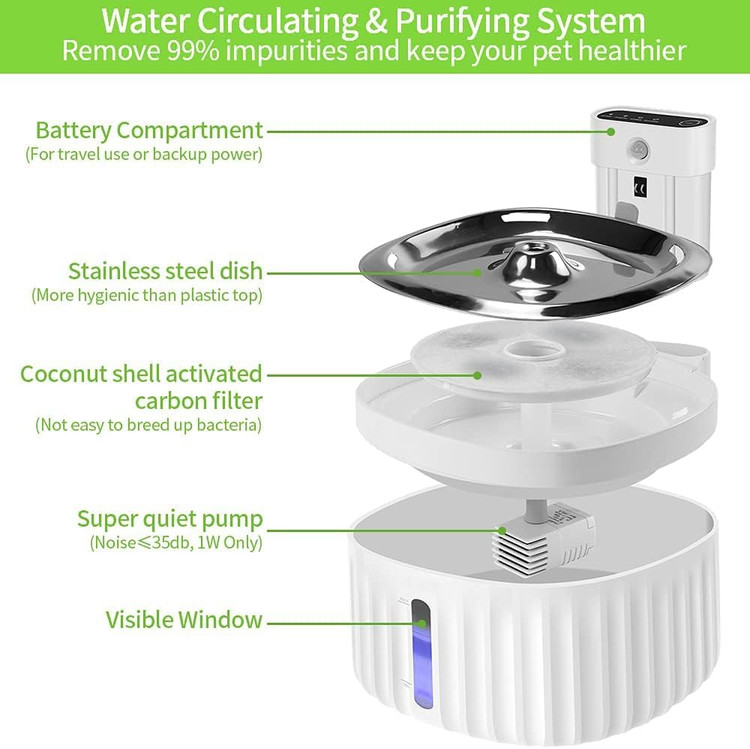 فوق العاده ساکت + قدرت کم + پمپ طولانی مدت: سکوت محض (35 دسی بل) این فواره آب آن را به دوستانه ترین آبنما تبدیل می کند که گربه ها می توانند به آن اعتماد کنند و والدین حیوان خانگی (مخصوصاً افرادی که سبک می خوابند) می توانند هنگام خواب به آن عادت کنند. پمپ 1 وات کم مصرف و ولتاژ پایین 5 ولت به دلیل داشتن یک موتور برتر و فیلتر پمپ داخلی، یک تن بیشتر در قبض برق صرفه جویی می کند و از تمام برندهای دیگر دوام می آورد تا پمپ را از انسداد و آسیب نجات دهد.