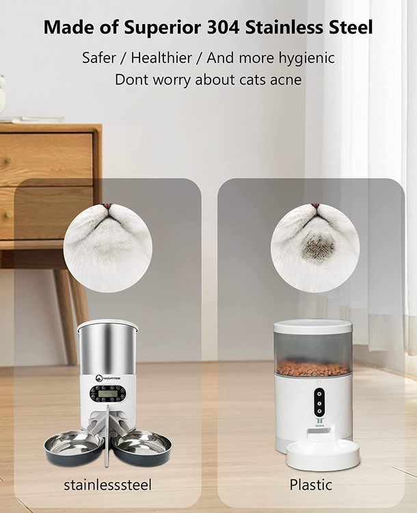 مواد فولادی ضد زنگ: فیدر هوشمند ما از فولاد ضد زنگ ساخته شده است. سطل و کاسه نگهداری غلات از فولاد ضد زنگ ساخته شده است. مخزن ذخیره غلات فولادی ضد زنگ را می توان از بدنه جدا کرد که برای تمیز کردن راحت است و حیوان خانگی شما را سالم نگه می دارد.