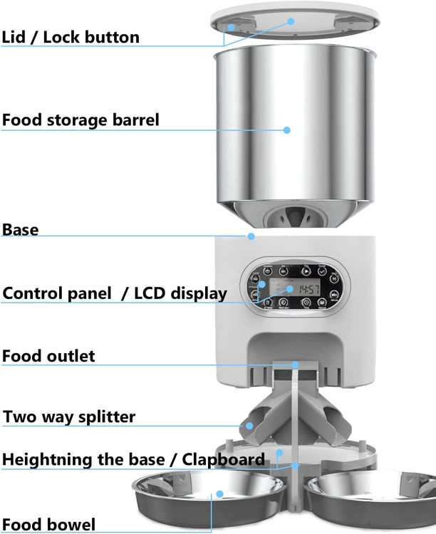 طراحی ضبط: این تغذیه خودکار دارای یک ضبط کننده و بلندگوی داخلی است که می تواند حیوان خانگی شما را با یک پیام طولانی 10 ثانیه برای خوردن صدا کند و به حیوان خود یادآوری کند که سه بار در زمان تعیین شده غذا بخورد.