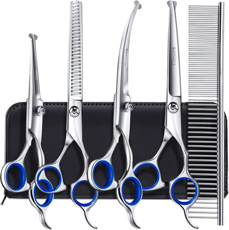 ست قیچی نظافت سگ حرفه ای از جنس استنلس استیل 6 در 1 Gimars با نوک گرد ایمنی، قیچی نظافت حیوانات خانگی با روکش تیتانیوم سنگین برای سگ، گربه و سایر حیوانات