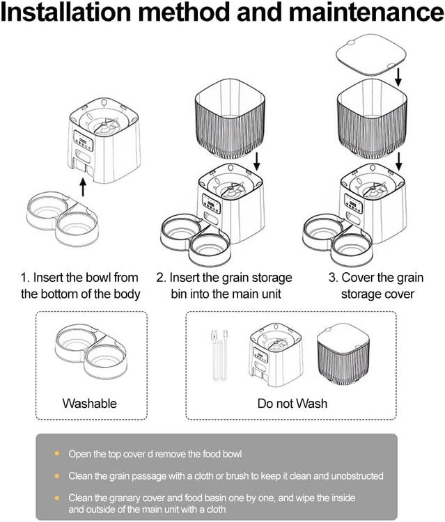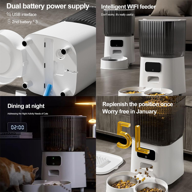 این دستگاه توسط 3 باتری و آداپتور برق باهم تغذیه می شود. با نصب باتری حتی در صورت قطع برق و wi-fi میتواند طبق برنامه تنظیم شده در برنامه تلفن به تغذیه حیوان خانگی شما ادامه دهد.