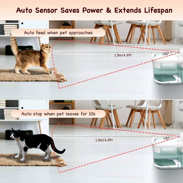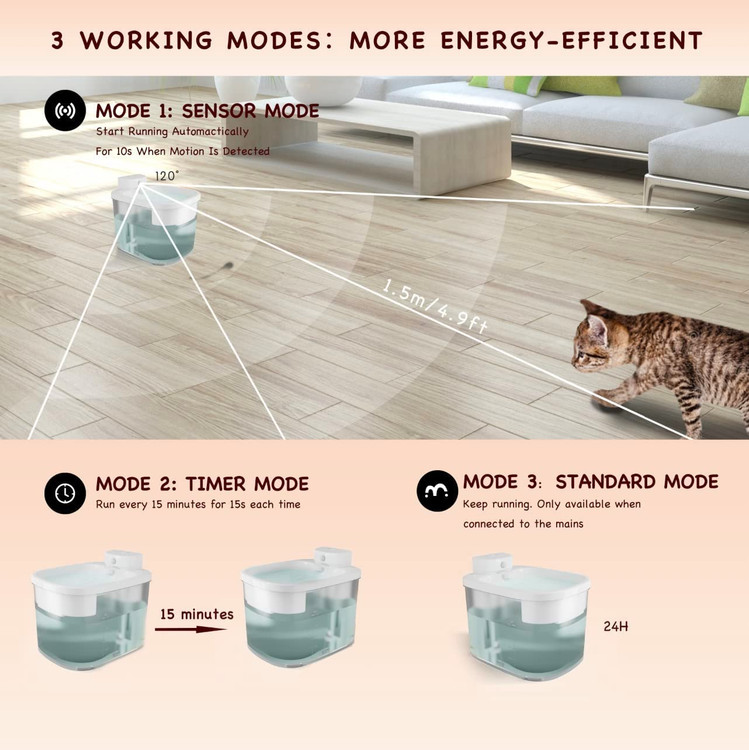 🐈حالت آب القایی: حالت سنسور خودکار، هنگامی که حیوان خانگی شما وارد منطقه سنجش (2-6 متری) می شود، یک فواره آب به مدت 20 ثانیه به طور خودکار آب را تخلیه می کند. صدای آب حیوانات خانگی کنجکاو را جذب می کند. با توجه به عادات نوشیدنی گربه، پس از یک بار تخلیه آب، 30 دقیقه می خوابد و سپس دوباره القایی را باز می کند.