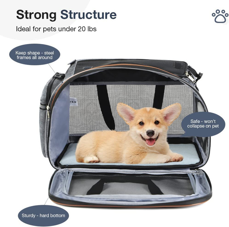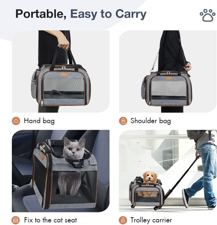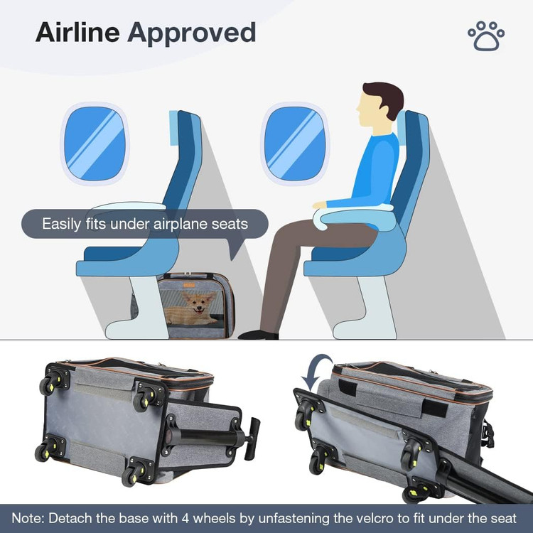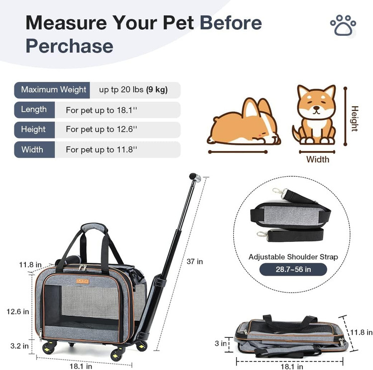 کریر حیوانات خانگی مورد تایید خط هوایی و جادار: ابعاد 20.5''Lx11.8''Wx12.6 اینچ (بدون چرخ)، این کالسکه مطابقت با استانداردهای TSA طراحی شده است و در زیر صندلیهای هواپیما وقتی چرخها برداشته میشوند، مناسب است. مناسب برای کوچک/متوسط حیوانات خانگی تا وزن 20 پوند (9 کیلوگرم).