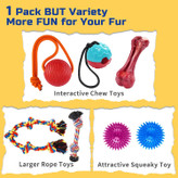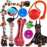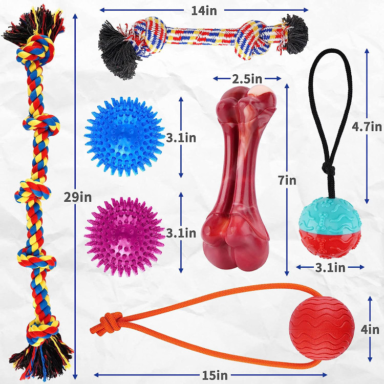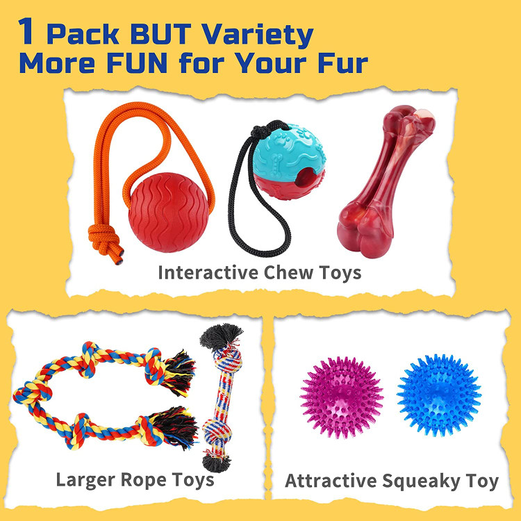 بسته 9 بسته اسباببازی جویدن سگ: مجموعه شامل 2* طناب سنگین (1 طناب کوتاه + 1 بلند)، 1*توپ درمان، 2*اسباببازی جیر جیر جذاب، 1*اسباببازی جویدن استخوان سخت، 1*اسباببازی یدک کش با توپ، 2* رول مدفوع .