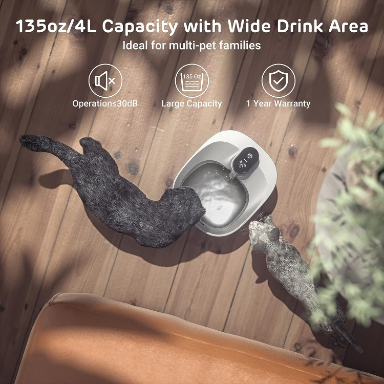 [در تمام روزها هیدراته بمانید] ظرفیت آب 4 لیتری، آب کافی را برای نوشیدن چندین حیوان خانگی فراهم می کند و لازم نیست نگران باشید که وقتی از خانه دور هستید، آب تمام شود. سینی آب عریض 210 میلیلیتری همچنان به فورکید شما اجازه میدهد در صورت قطع برق به خوبی هیدراته شود. آبنما به اندازهای پایدار است که گربههای بدجنس شما هرگز آن را زمین نمیزنند.