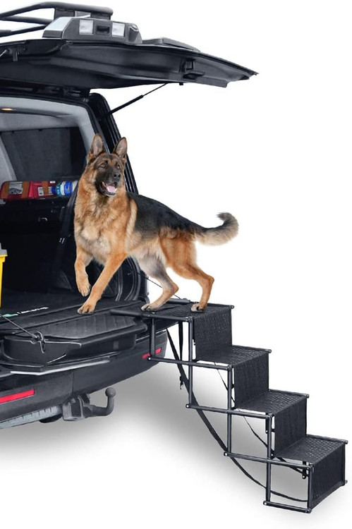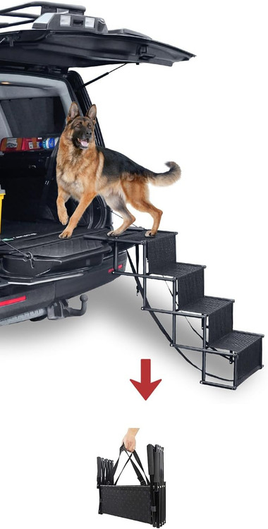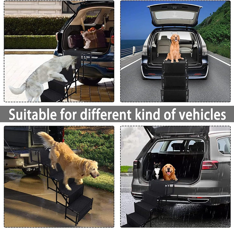 رمپ سگ با 4 پله، قاب ارتقا یافته پله های حیوان خانگی برای SUV، ماشین ها، تخت های مرتفع، پله های قابل حمل و تاشو برای سگ های بزرگ با وزن سبک و سطح غیر لغزنده