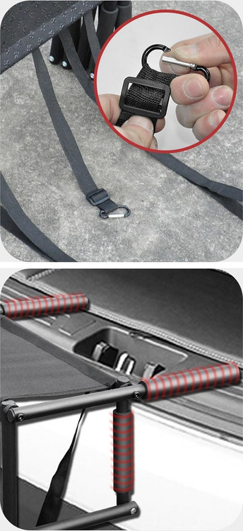 ایمن و ایمن: این رمپ سگ برای سگهای بزرگ دارای پلههای پارچه نایلونی با کشش روی سطح و پدهای لاستیکی در پایین پاها است تا از لغزش و عدم لیز خوردن پلههای سگ اطمینان حاصل شود. علاوه بر این، دستگیره های پوشیده از فوم و یک کارابین فولادی ضد زنگ که می تواند به وسیله نقلیه متصل شود و پله ها را در جای خود محکم نگه دارد.