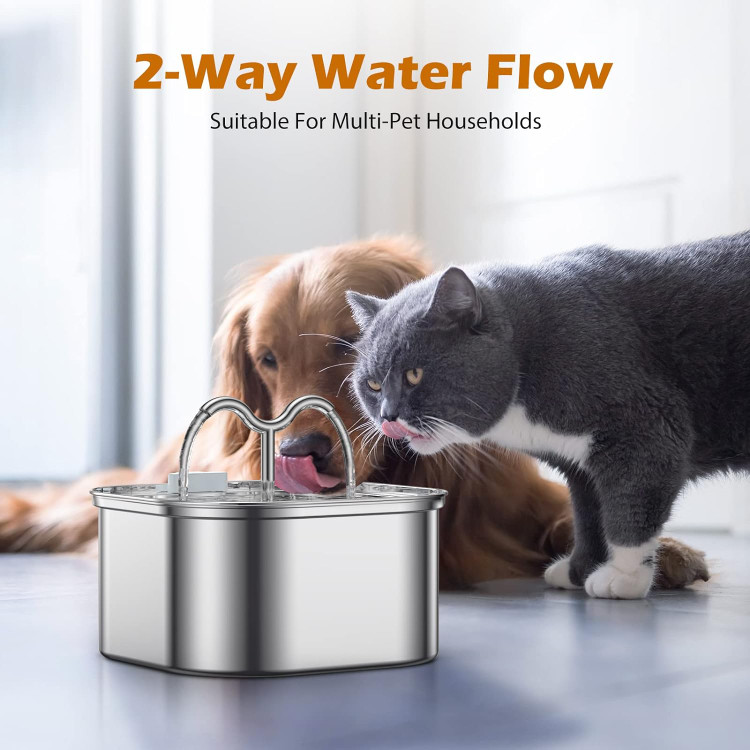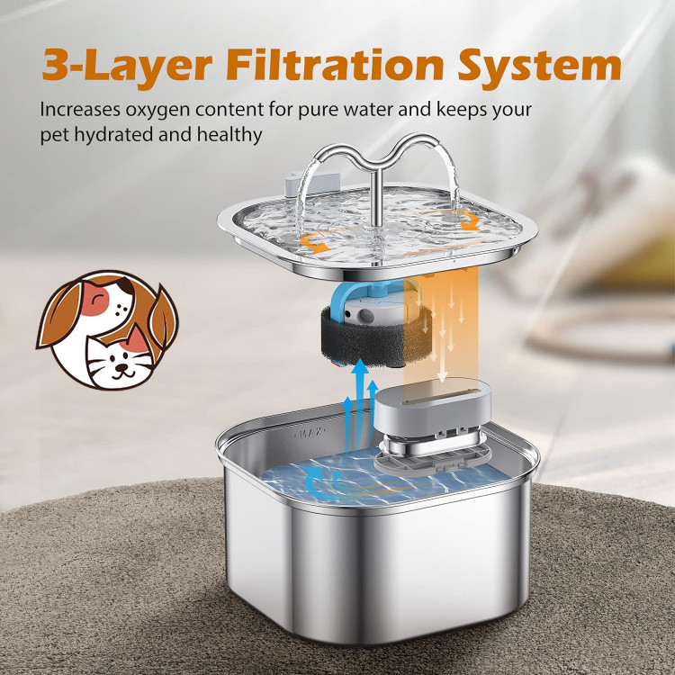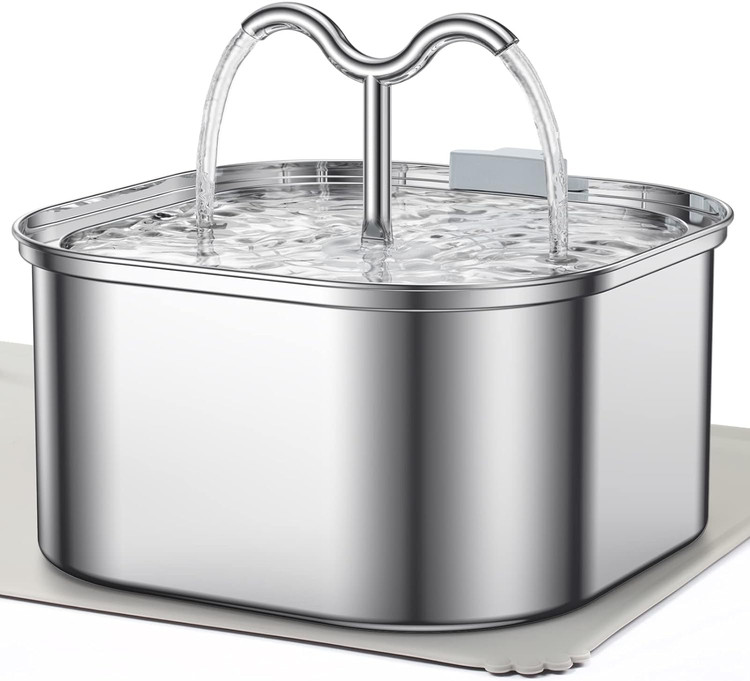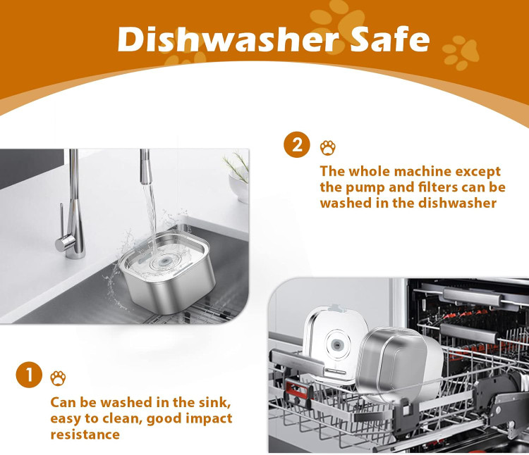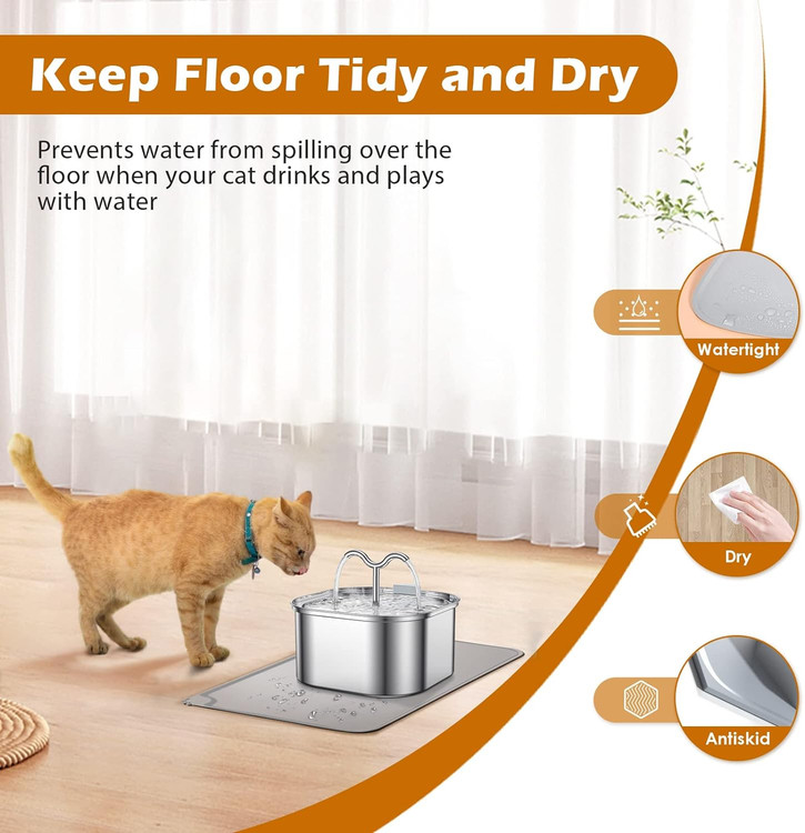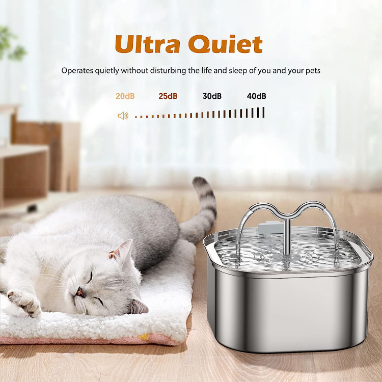 پمپ آب فوق العاده بی صدا: فواره گربه ای شیک از جنس استیل ضد زنگ دارای یک پمپ فوق العاده بی صدا (زیر 20 دسی بل) و یک پمپ 1.5 وات کم مصرف است. صدای پمپ تقریبا قابل شنیدن است و خواب خوبی را برای شما و حیوان خانگی تان تضمین می کند.
