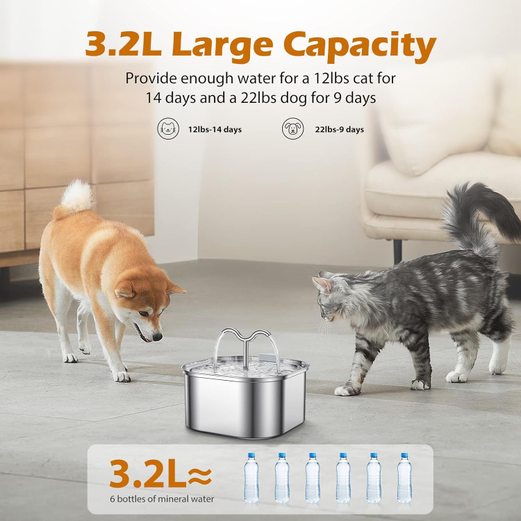 کاسه آب با ظرفیت بزرگ: آب پخش کننده حیوانات خانگی دارای ظرفیت 3.2 لیتر در 108OZ است که 14 روز آب آشامیدنی برای گربه ها و 9 روز برای سگ های کوچک و متوسط فراهم می کند. ظرفیت ذخیره سازی آب بزرگ برای خانواده های چند حیوان خانگی بدون نیاز به پر کردن مکرر آب ایده آل است و برای والدین حیوانات خانگی که سفر می کنند بسیار عالی است.
