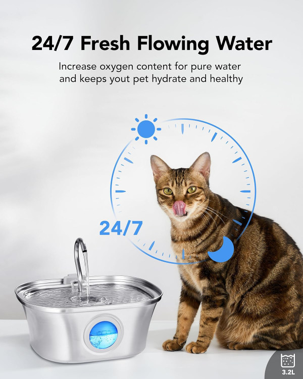 🐶【108oz/3.2L ظرفیت بزرگ】با ظرفیت سخاوتمندانه 3.2L/108oz، آبنمای سگ ما می تواند چندین حیوان خانگی را تامین کند و آب تازه را تا 2 هفته بدون نیاز به پر کردن مکرر تامین کند. حیوانات خانگی شما همیشه به آب تمیز و گوارا دسترسی خواهند داشت، حتی زمانی که شما در اطراف نباشید.