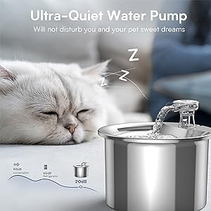آبنمای گربه دارای پمپ آب بی صدا، صرفه جویی در انرژی، کمبود برق، ضد خشکی، پمپ حفاظتی می باشد. فواره حیوان خانگی از جنس استنلس استیل اتوماتیک با طراحی با ظرفیت بالا، بی صدا، بر خواب شما و حیوان خانگی شما تاثیری نخواهد داشت. آبنمای حیوانات خانگی از مواد غذایی ساخته شده است که بادوام، بهداشتی و تمیز کردن آسان است.