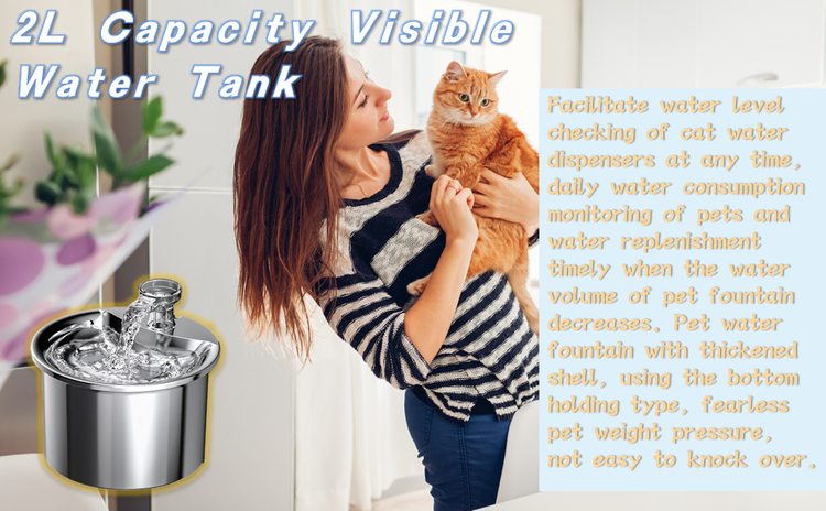 【مخزن آب قابل مشاهده با ظرفیت 2 لیتر】 بررسی سطح آب دستگاه های پخش آب گربه را در هر زمان تسهیل می کند، نظارت بر مصرف آب روزانه حیوانات خانگی و پر کردن آب به موقع زمانی که حجم آب آبنمای حیوانات خانگی کاهش می یابد. فواره آب حیوان خانگی با پوسته ضخیم، با استفاده از نوع نگهدارنده پایین، فشار وزن حیوان خانگی بدون ترس، ضربه زدن به آن آسان نیست.