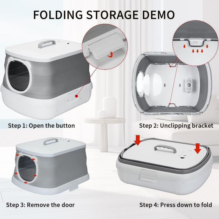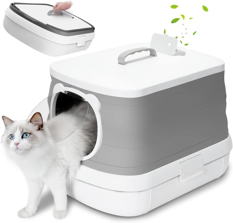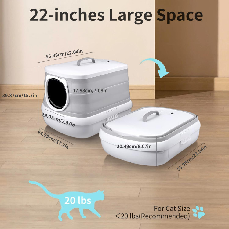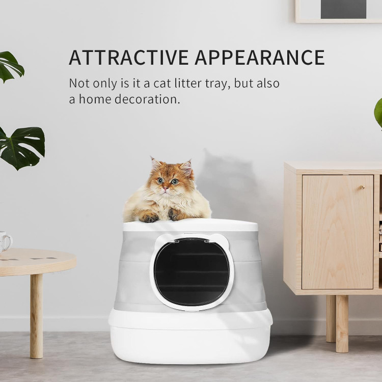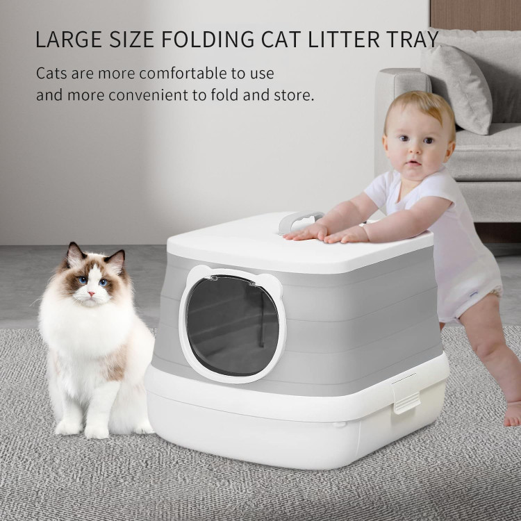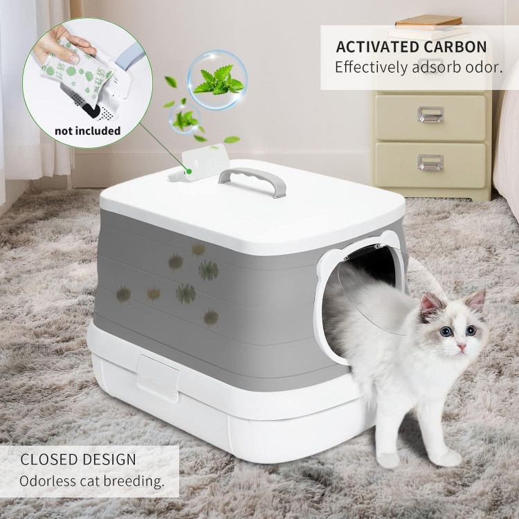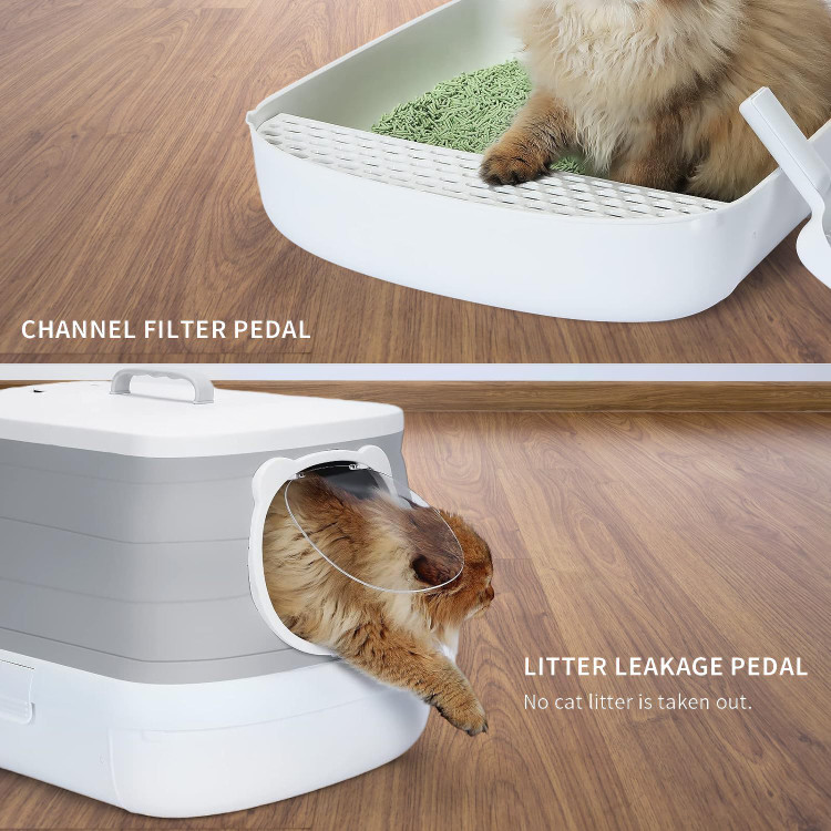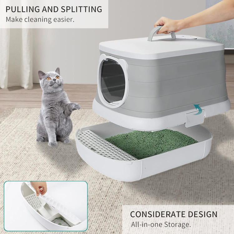 جعبه خاک گربه 13 لیتری کاملاً پوشیده، جعبه بستر تاشو و قابل حمل با بیل و فضای نگهداری، از نشت ادرار و بستر جلوگیری می کند، بوی بد را جدا می کند، خاکستری