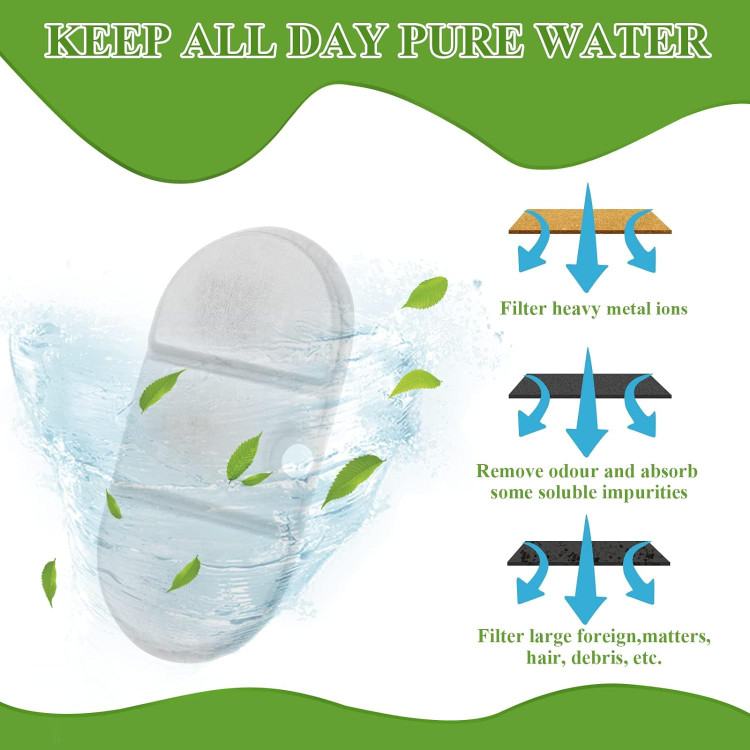 فیلتر آبنمای حیوانات خانگی که از یک لایه پنبه، کربن فعال و یک رزین تبادل یونی تشکیل شده است، به طور موثر مو، فلزات سنگین را می گیرد، آب را تازه نگه می دارد و طعم آب را همیشه بهبود می بخشد.