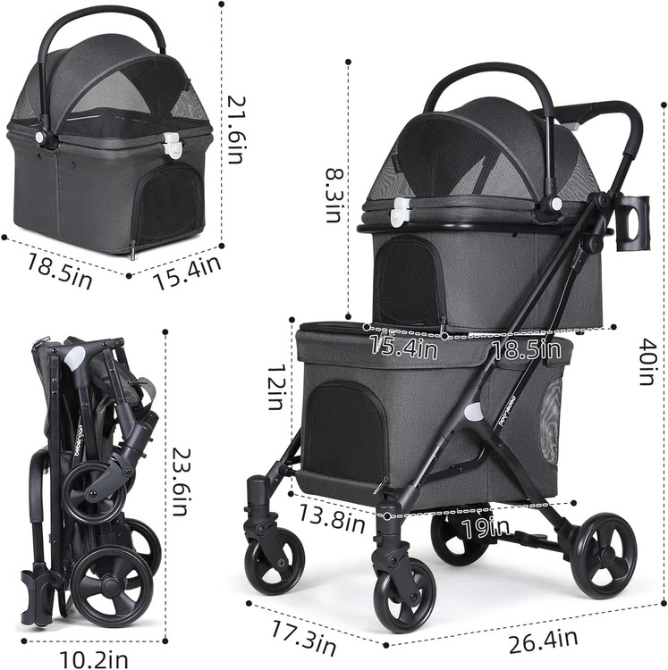 قابلیت جابجایی و فضای ذخیره سازی: گاری های حیوانات خانگی دو طبقه را می توان با یک کلیک تا کرد و باز کرد تا ذخیره سازی و حمل آسانی داشته باشد. برای قرار دادن آسان در صندوق عقب خودرو یا داخل خانه، میتوان آنها را به سرعت تا کرد و در یک اندازه جمع و جور کرد. علاوه بر این، گاریهای حیوانات خانگی دو طبقه مجهز به جیبهای ذخیرهسازی اضافی یا جا لیوانی برای صاحبان حیوانات خانگی برای نگهداری وسایل ضروری هستند.