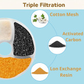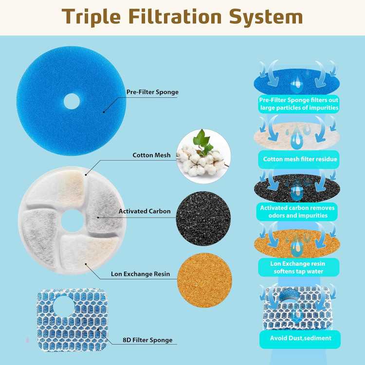 سیستم تصفیه سه گانه: آبنمای حیوانات خانگی از سیستم فیلتراسیون پیشرفته استفاده می کند. این فیلتر دارای سه سطح فیلتراسیون است: پنبه، کربن فعال و رزین تبادل یون، به طور موثر موهای حیوانات خانگی، خاک و فلزات سنگین را فیلتر می کند تا آب خالص را فراهم کند و تمیز کردن را آسان تر کند.