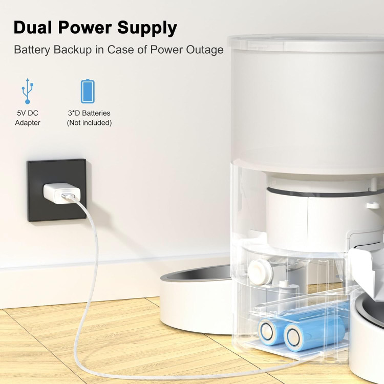 گزینه های برق دوگانه: این تغذیه گربه خودکار با کنترل WiFi شامل یک آداپتور USB 5 ولت برای برق اولیه و انعطاف پذیری برای استفاده از 3 باتری سلول D قلیایی به عنوان یک پشتیبان قابل اعتماد در صورت قطع برق، تضمین کننده برنامه ریزی بدون وقفه است. تغذیه یک مجموعه از باتری ها می تواند تا 2 روز برق را تامین کند و اطمینان حاصل کند که حیوان خانگی شما حتی در زمان غیبت شما به خوبی تغذیه می شود.