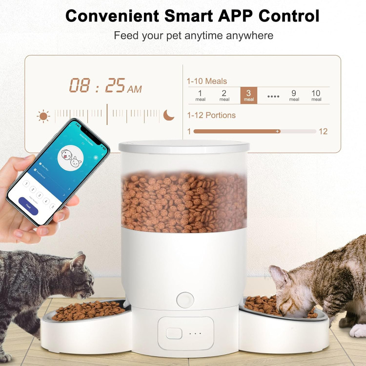 مدیریت برنامه راحت: تغذیه گربه خودکار مجهز به WiFi به طور یکپارچه به شبکه WiFi فقط 2.4 گیگاهرتز شما متصل می شود. با استفاده از برنامه بصری SMART LIFE در تلفن هوشمند iOS یا Android خود، به راحتی وعده های غذایی حیوان خانگی خود را از هر کجا و در هر زمان برنامه ریزی و نظارت کنید. حداکثر 10 وعده غذایی روزانه را با وعده های مختلف از 1 تا 12 در هر وعده (0.28-0.35 اونس/غذا) سفارشی کنید و بدون زحمت سیاهه های مربوط به تغذیه را مرور کنید تا مطمئن شوید گربه یا سگ شما از برنامه غذایی ثابتی برخوردار است، همه در برنامه.