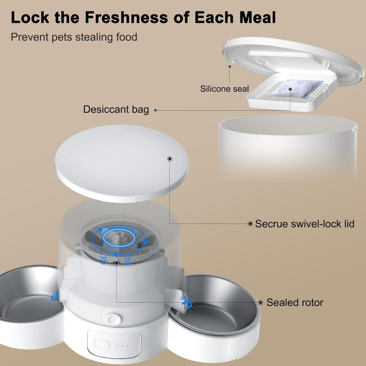 طراوت هر وعده غذایی را قفل کنید: دستگاه پخش خودکار غذای گربه ما دارای یک کیسه خشک کن داخلی و یک نوار آب بندی مطمئن است که به طور موثری تازگی و تردی غذای حیوان خانگی شما را حفظ می کند. علاوه بر این، یک کیسه خشک کن در درب برای رطوبت زدایی و جلوگیری از نفوذ رطوبت عمل می کند. طراحی نوآورانه درب گردان مهر و موم شده به طور خودکار درگاه تغذیه را پس از هر وعده غذایی بسته می کند و مانعی در برابر مورچه ها و حشرات ایجاد می کند.