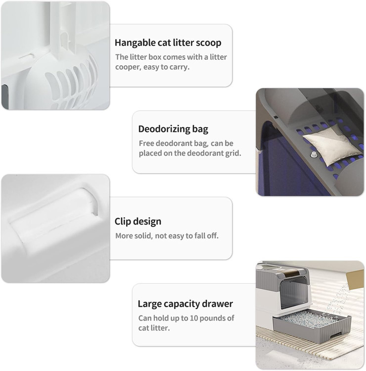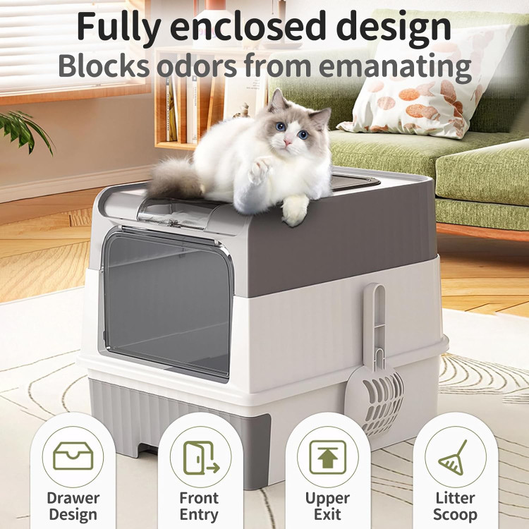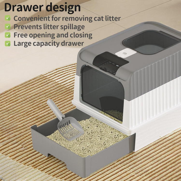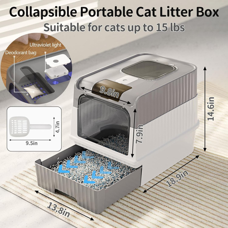 جعبه بستر خاک گربه کشودار تاشو UV با درب، توالت بزرگ ضد نشتی در کنارههای بالا، شامل اسکوپ دستی، تمیز کردن آسان و کنترل بو (خاکستری، بزرگ)