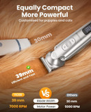 اصلاح آسان: 3 سرعت قابل تنظیم، که میتوانند تا 7000 دور در دقیقه افزایش یابند. هر سرعت برای قسمتهای مختلف بدن حیوان خانگی شما طراحی شده است. بنابراین، اگر تازه شروع به اصلاح حیوان خانگی کردهاید، این کار بسیار آرامشبخشتر و لذتبخشتر خواهد بود. استفاده از آن برای مبتدیان واقعاً آسان است.